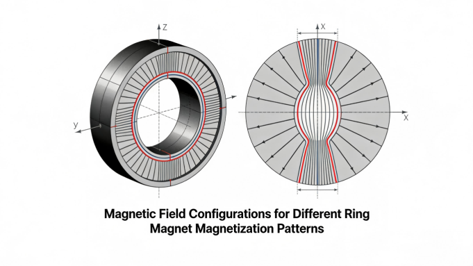 Magnetización radial:Polos magnéticos en las superficies cilíndricas interior y exterior. Preferido para motores CC sin escobillas, servomotores y codificadores rotativos donde el campo magnético es paralelo al eje de rotación.